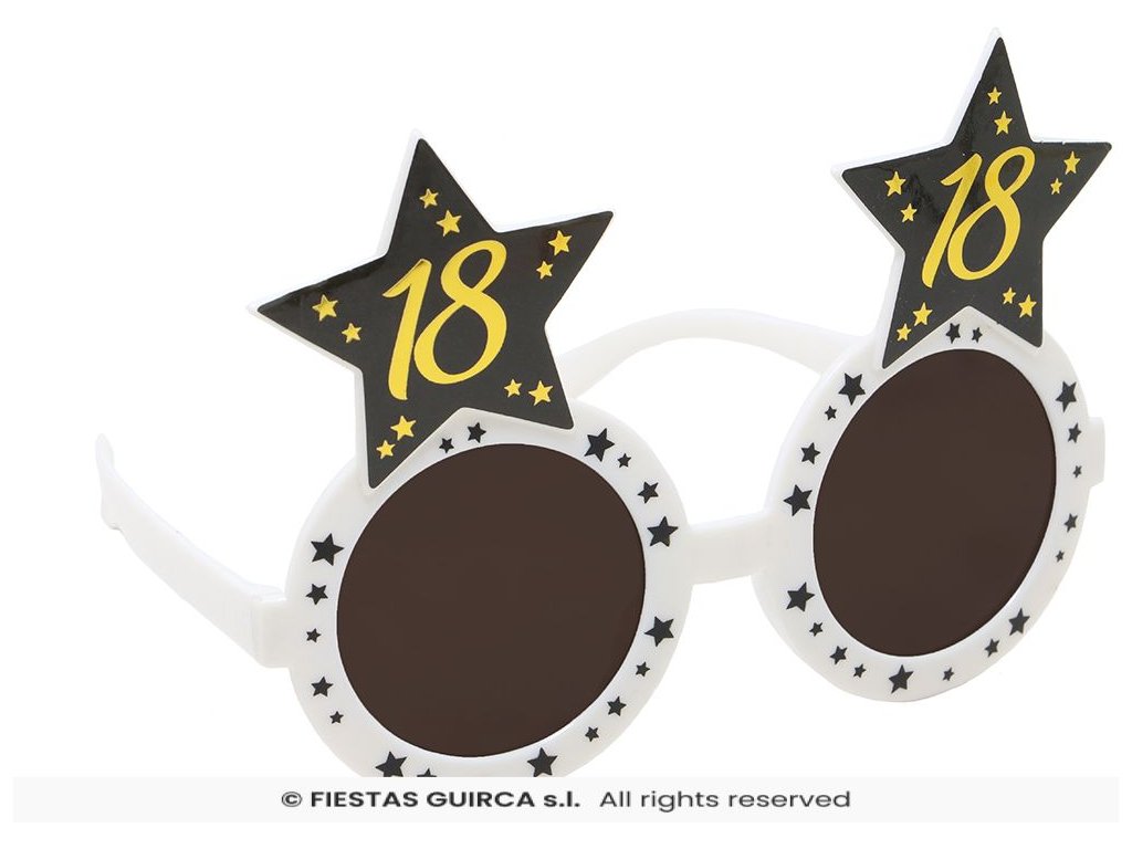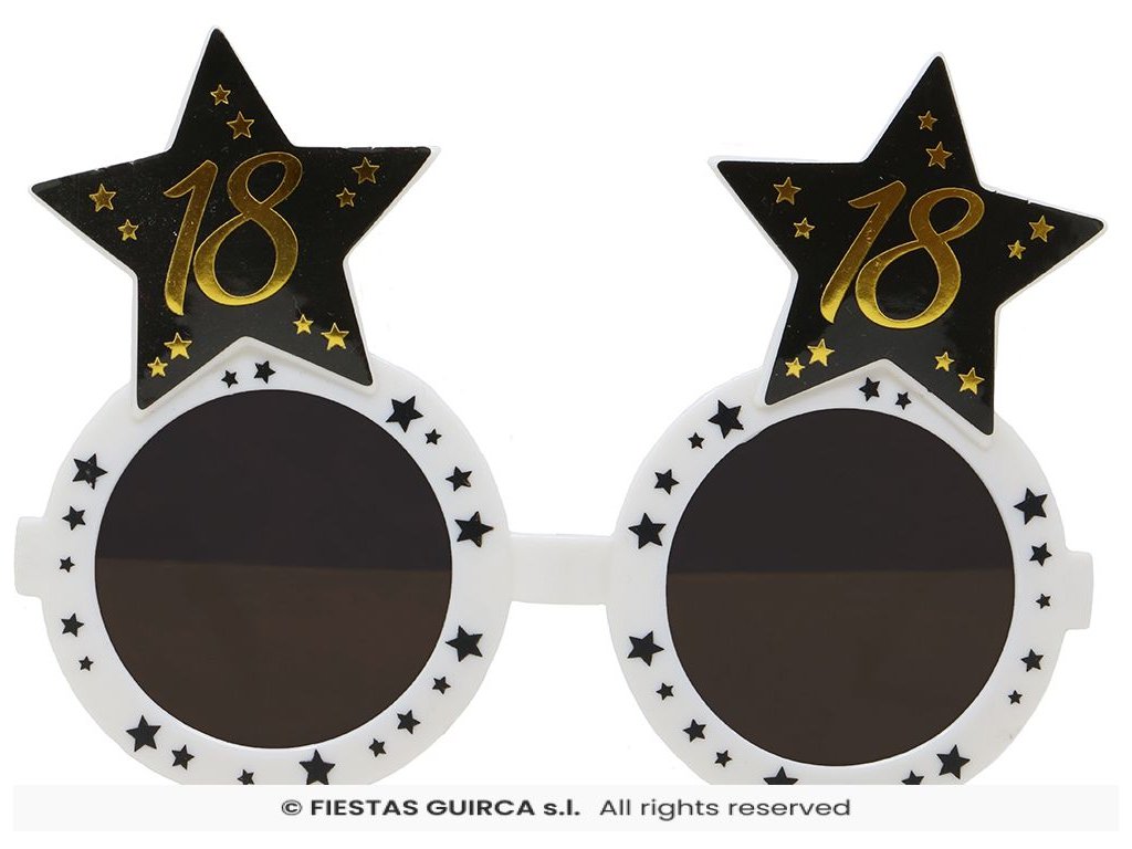 Fun 18th birthday glasses with black stars! These white plastic glasses with black lenses and star decorations will add the perfect party vibe. An ideal cheap costume accessory for celebrations, carnivals, and themed parties.