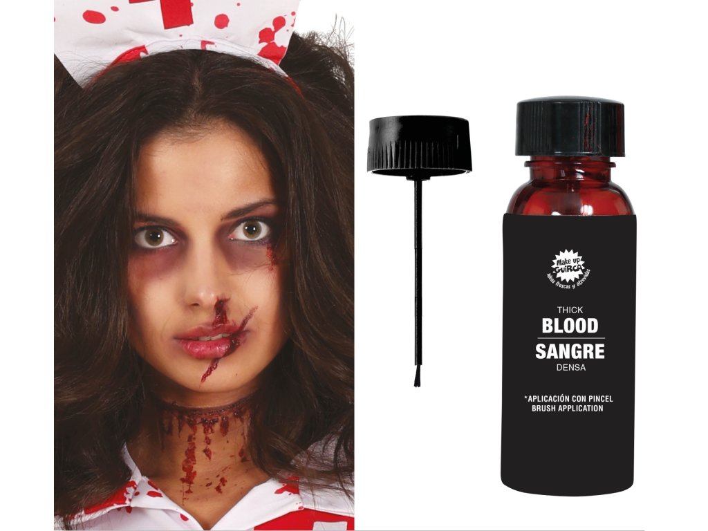 High-quality thick fake blood with a practical brush applicator. Perfect for Halloween, horror costumes, and special effects. Volume: 60 ml.