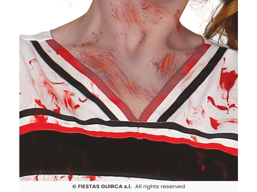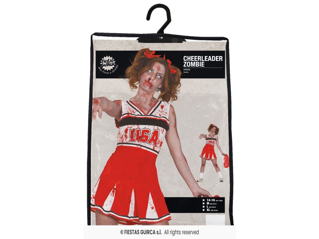 Get ready for spooky fun with this women's zombie cheerleader costume, the perfect choice for Halloween, themed parties, or horror events. The costume includes only the dress, designed in a classic cheerleader style with a creepy zombie twist. The dress features a red skirt with white and black details and a white top with the word "USA," covered in realistic blood splatters. Made of 100% polyester, the costume ensures comfort and easy maintenance. It is available in teen size (14–16 years) and women's sizes M (38–40), L (42–44), and XL (44/46). Other accessories, such as pom-poms, makeup, or shoes, are for illustration purposes only and are not included. This costume is ideal for anyone looking to make a striking impression at Halloween or themed events. Get ready for a night full of spooky vibes and fun!