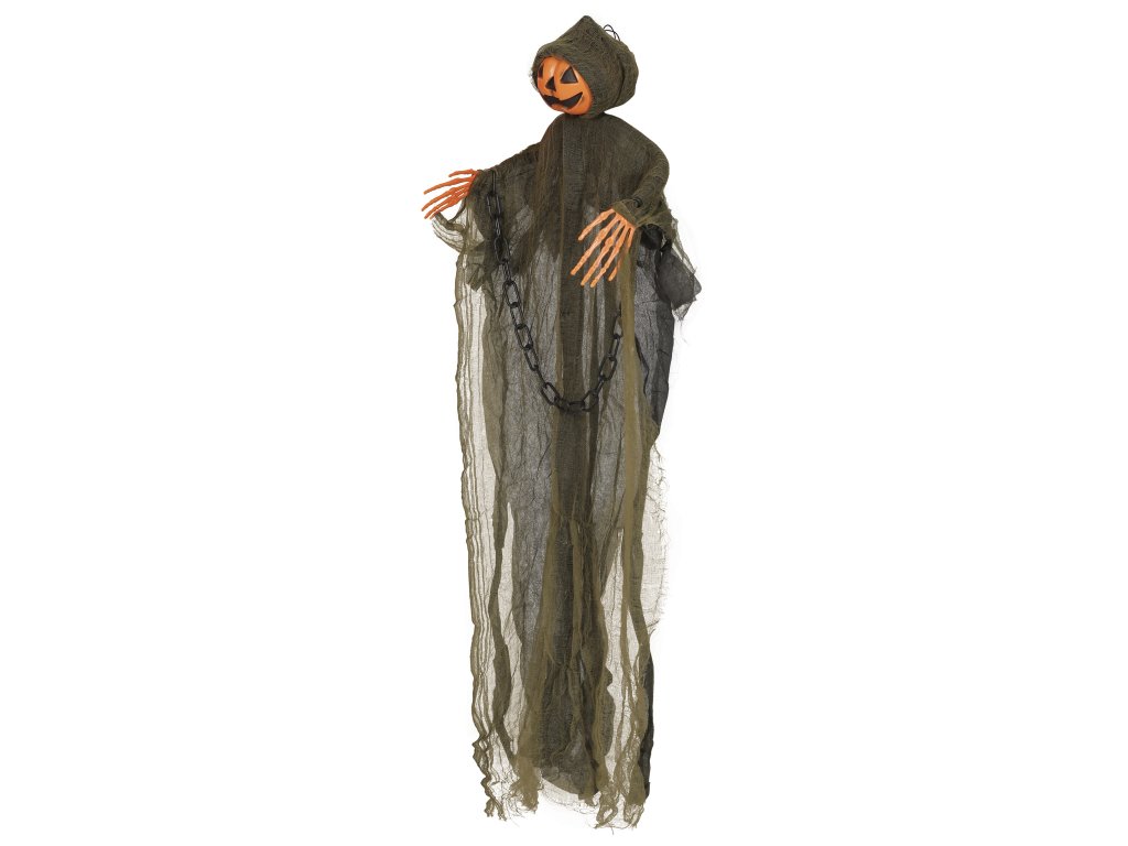Spooky hanging ghost with a pumpkin head, skeletal hands, and a chain. Height: 98 cm. Perfect Halloween decoration.