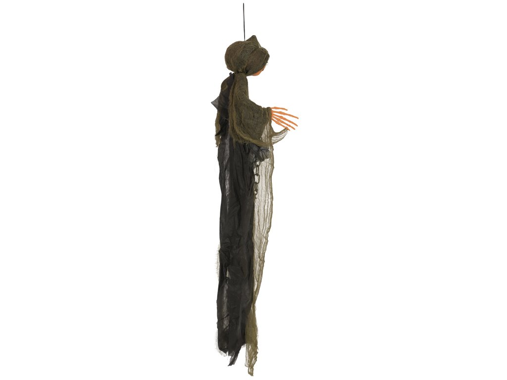 Create a chilling atmosphere with this hanging ghost, the perfect decoration for Halloween. The decoration features an orange jack-o'-lantern head with carved spooky details, skeletal hands, and a body draped in tattered olive-green fabric for an authentic eerie look. A black plastic chain hangs across the chest, enhancing the horror effect. The ghost is 98 cm tall and comes with a hanging loop, making it easy to place wherever you like. This decoration is ideal for creating a spooky vibe in your garden, indoors, or at themed parties. Get ready for Halloween and impress your guests with this terrifying ornament!