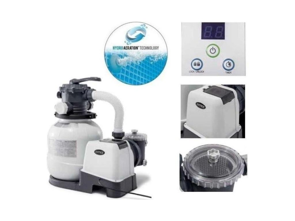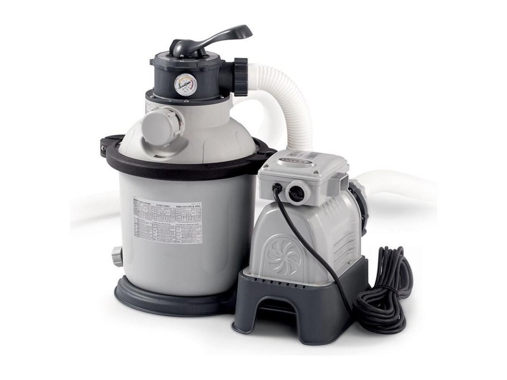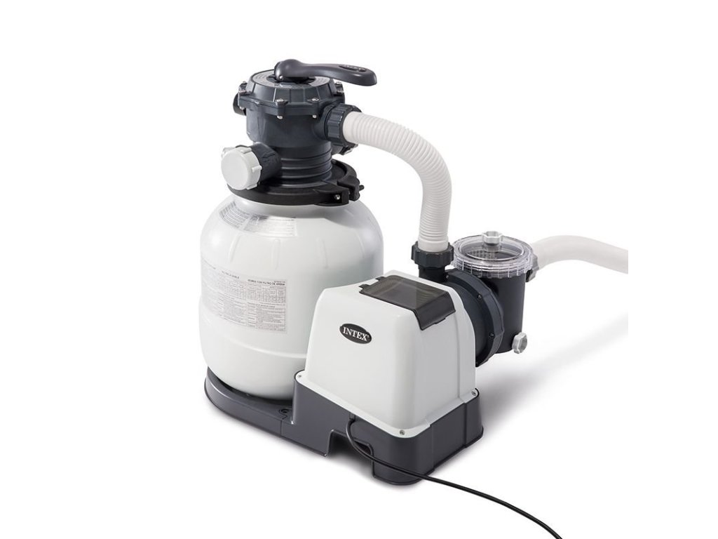 Vysocevýkonná filtrace pro všechny INTEX bazény - Provedení s dvojitým uzemněním. Křemičitý písek, který klade protékající vodě z bazénu přirozený odpor, zachycuje v mezerách většinu nečistot. Vyčištěná voda se pak opět vrací zpět do bazénu. Písková filtrace a její princip se používá i při čištění pitných vod, protože jednoduché a levné čištění resp. výměna pískové náplně výrazně snižuje provozní náklady.