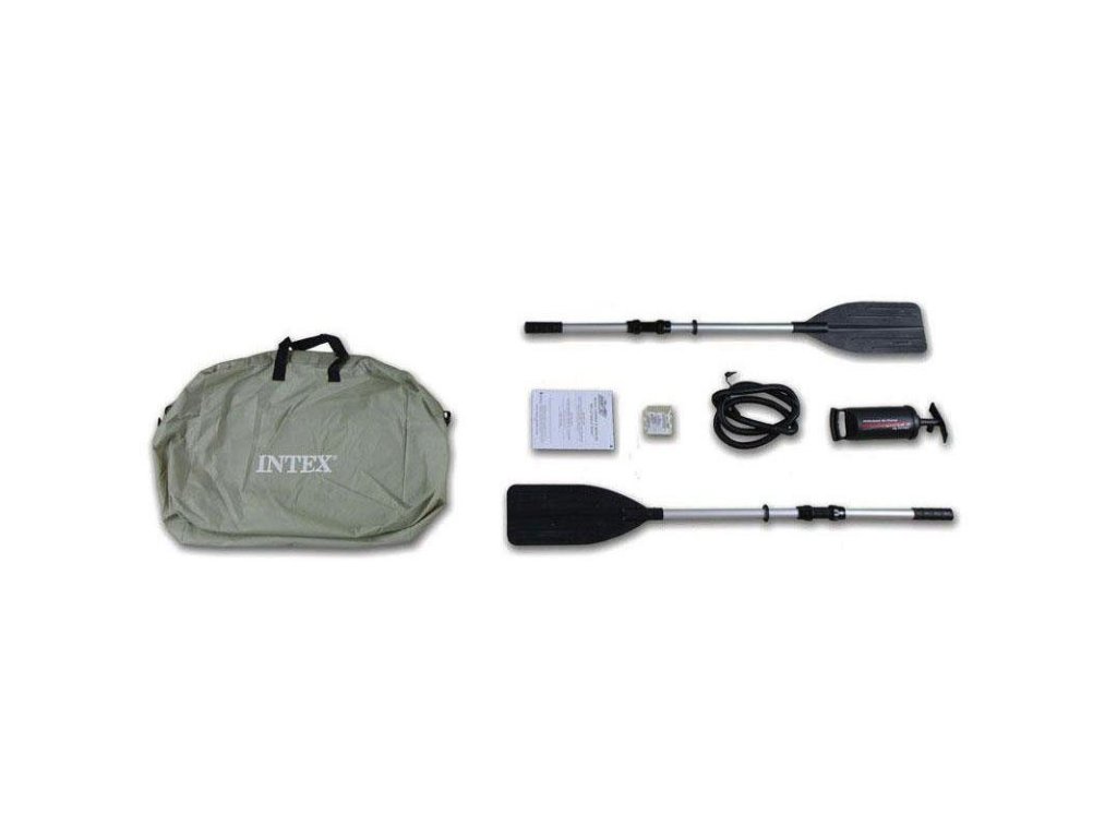 Součástí člunu jsou dvě nafukovací sedátka s oporou zad, jeden vak na výbavu a dva držáky na rybářské pruty.Člun v zadní části disponuje otvory pro připevnění motoru, který není součástí sestavy. Kolem člunu je lano pro snadnější manipulaci. Součástí člunu jsou hliniková pádla Intex a pumpa.