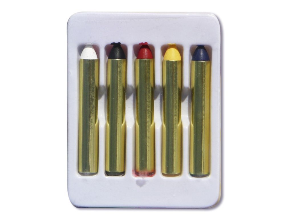 Farebné ceruzky na líčenie na rôzne tematické akcie. Balenie obsahuje 5 základných farieb (biela, čierna, červená, modrá a žltá).